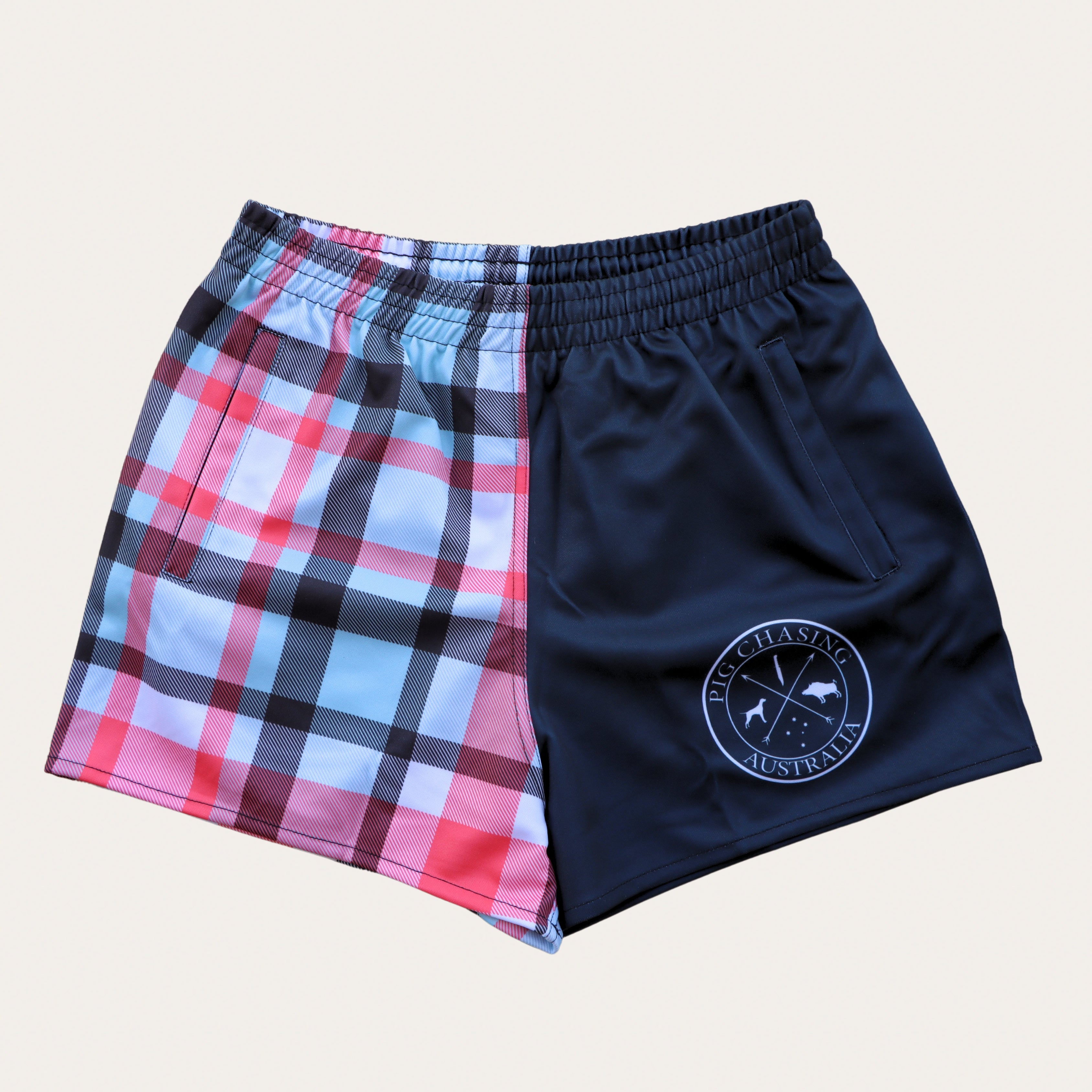 Plaid Footy Shorts - Blue/Black/Red - Zip Pockets