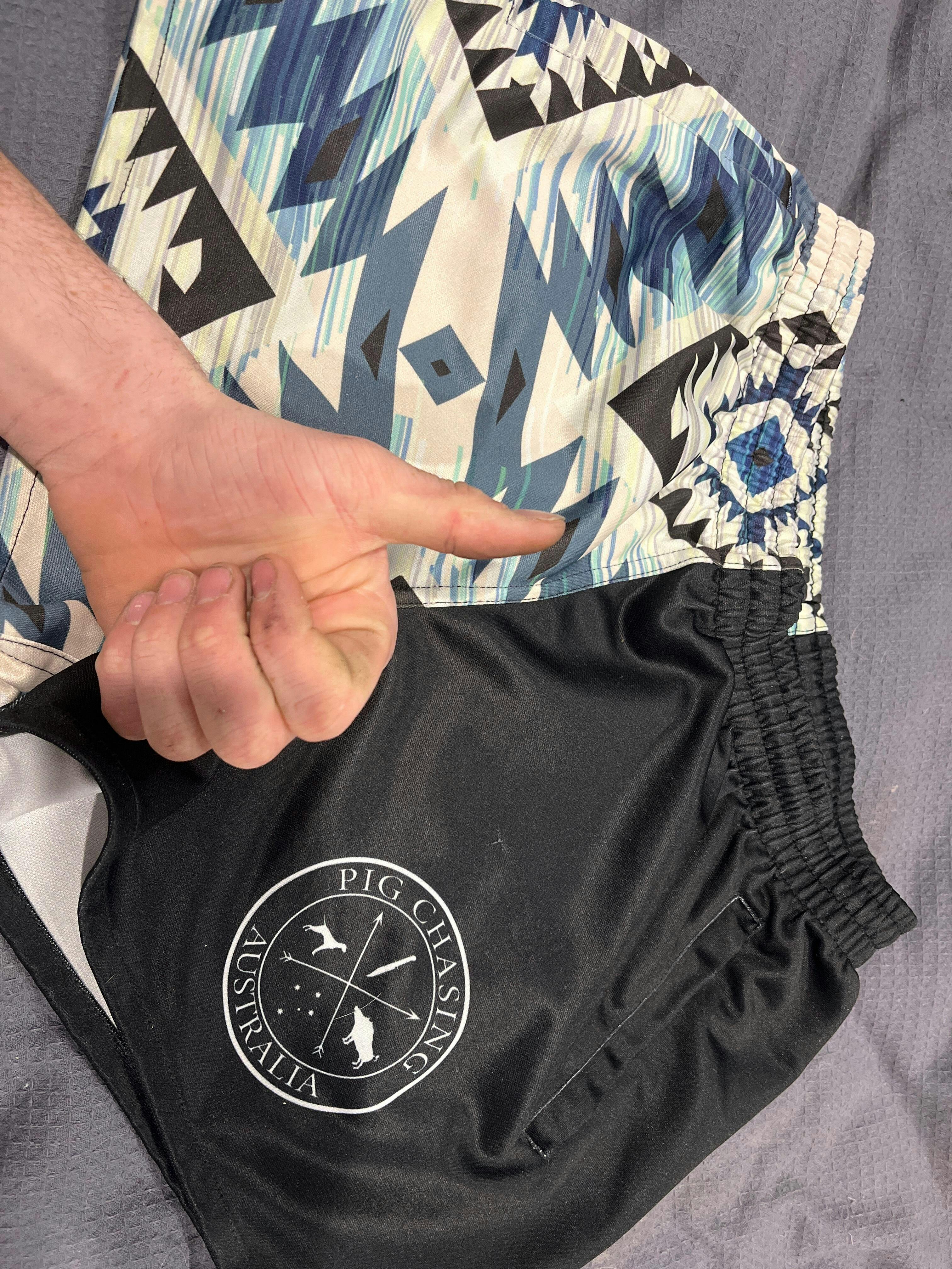 Footy Shorts - Blue/Black Aztec - ZIP Pockets!