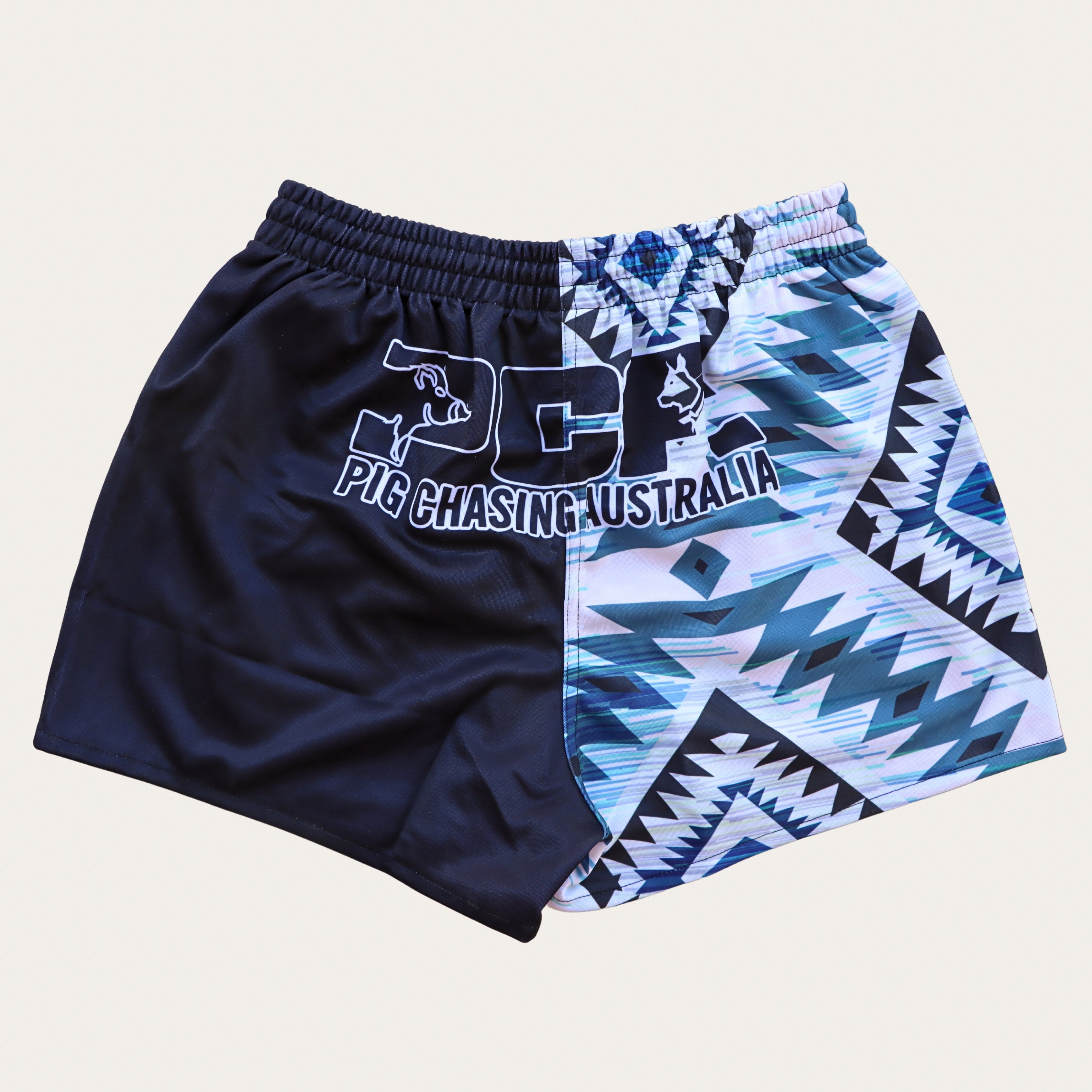 Footy Shorts - Blue/Black Aztec - ZIP Pockets!