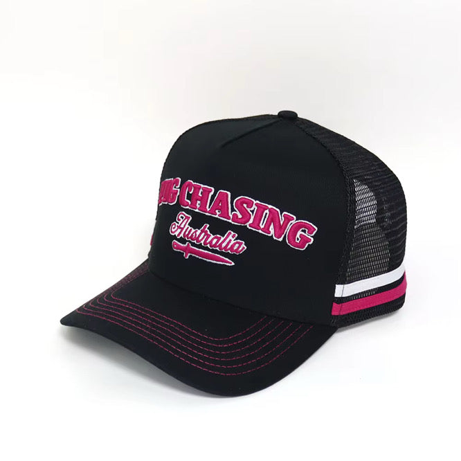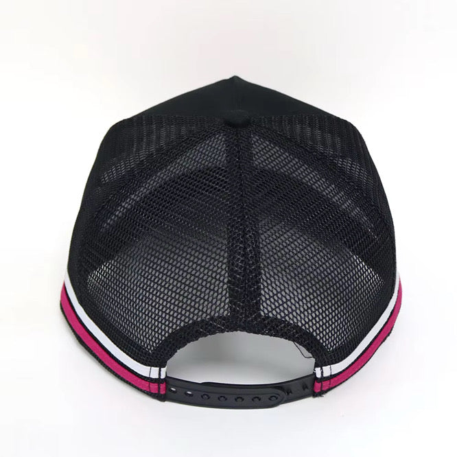 Elevate your style with our modern Pink Black Cursive Trucker Cap! Made with high-quality materials, this cap adds a touch of sophistication to any outfit. Stand out from the crowd and make a statement with its sleek design. Perfect for any fashion-forward individual.